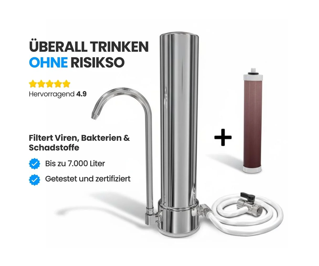 Leistung & Zertifizierung: Der Filter ist unabhängig getestet und zertifiziert – unter anderem vom Institut Pasteur – und filtert bis zu 7.000 Liter Wasser pro Kartusche.