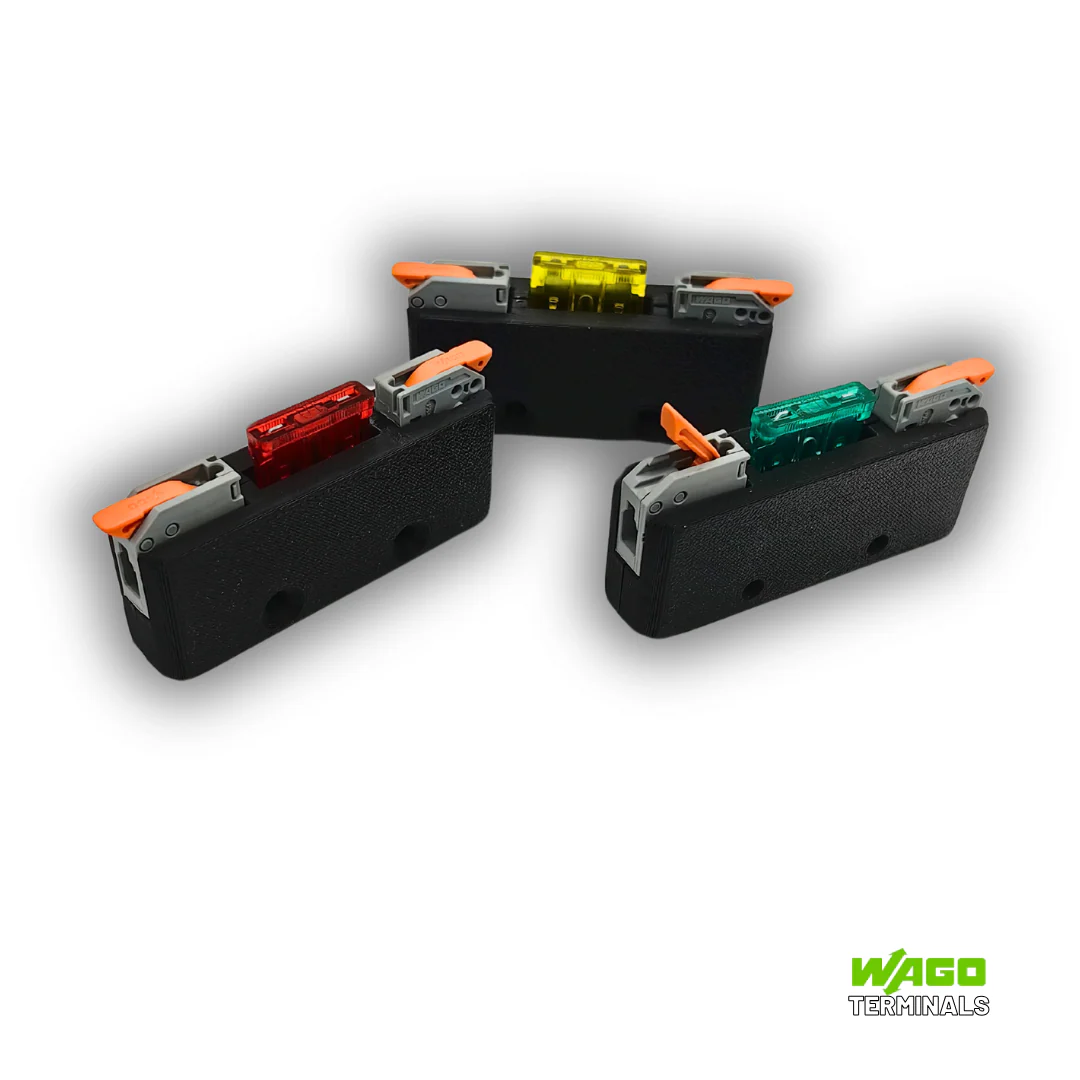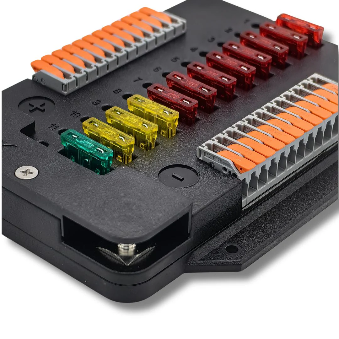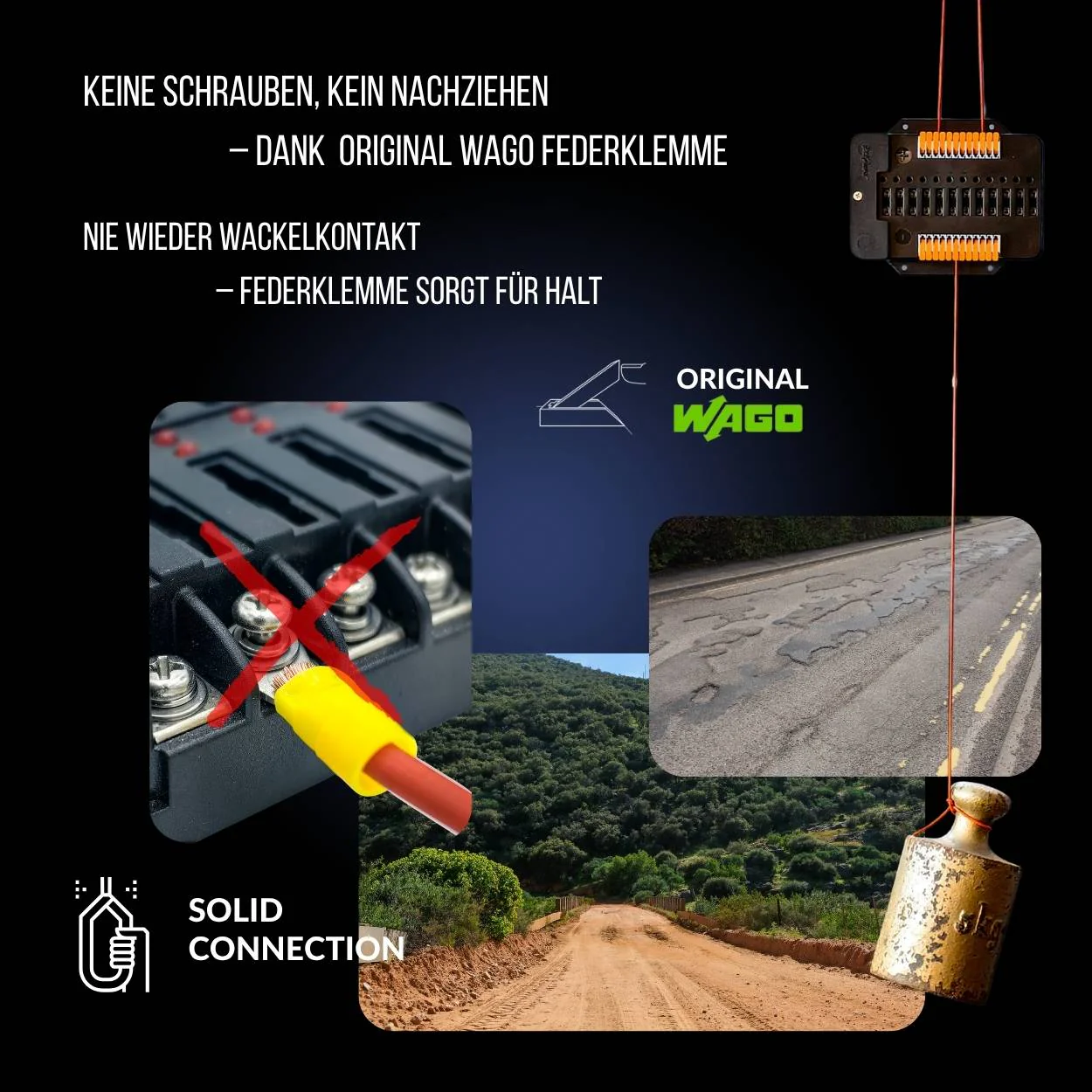 Die FUSY-Familie skaliert mit dem Bedarf: vom ultrakompakten Micro (1 Kanal, 60×14×28 mm) über Mini (6 Kanäle) und Standard (12 Kanäle, max. 100A Gesamtstrom) bis zum Maxi mit 18 Kanälen und bis zu 200A. Alle Varianten sind für 12V und 24V geeignet. Für die Verkabelung setzt der FUSY auf original WAGO-Hebelklemmen – vibrationssicher, werkzeugfrei anschließbar und ohne aufwendiges Crimpen.